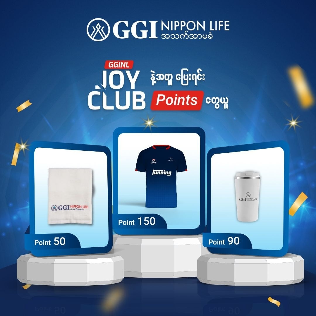 GGI Nippon Life ရဲ့ Running Club မှာ လာရောက်ဆင်နွှဲကြတဲ့ GGI Nippon Life ရဲ့ Member တွေကိုPoint တွေပေးသွားမှာဖြစ်ပြီး အဲ့ဒီ့ Point တွေအပေါ်မူတည်ကာ အမှတ်တရလက်ဆောင်တွေကိုပြန်လည်ထုတ်ယူလို့ရနေပြီဖြစ်ပါတယ်။ လူကြီးမင်းတို့ရရှိတဲ့ Point အပေါ်မူတည်ပြီး ပြန်ပေးသွားမယ့်လက်ဆောင်တွေကတော့ Point 50 အတွက် GGINL Logo ပါတဲ့ Towel တစ်ထည်၊ Point 90 အတွက် GGINL Logo ပါဝင်တဲ့ အပူ/အအေးခံ Coffee ခွက်နဲ့ Point 150 ရရှိသူတွေအတွက်ကိုတော့ GGI Nippon Life Running Club အမှတ်တံဆိပ်ပါ
